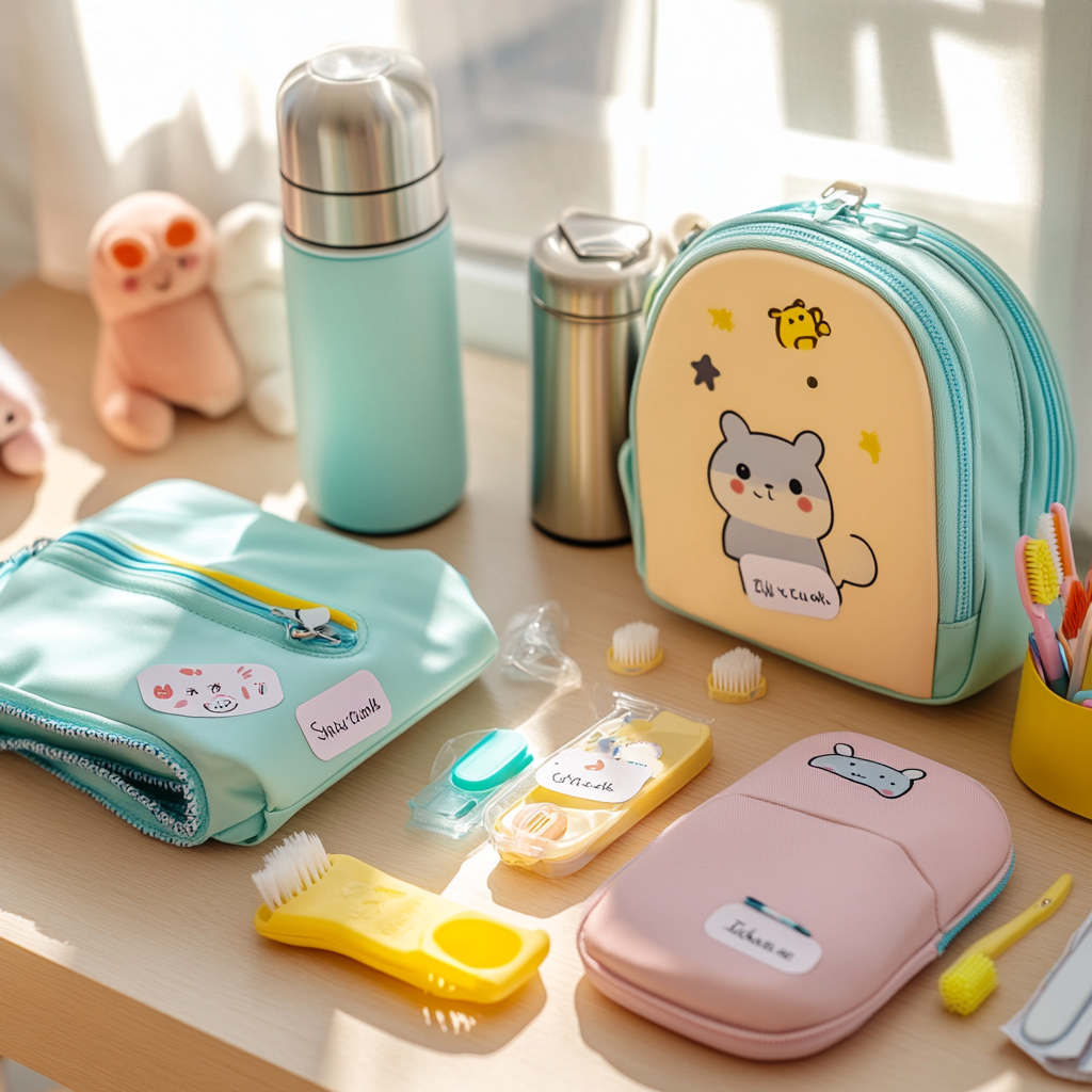 - 방수 네임 스티커: 식판, 물통, 칫솔 등 물이 닿는 곳에 필수입니다. 유포지 재질이 잘 안 찢어지고 오래가요.